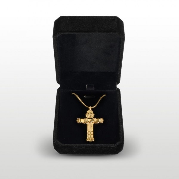 This beautiful Gold Cross is a traditional and sensitive keepsake to hold the ashes of your departed loved one. This stunning piece has been cleverly designed with the Claddagh forming the arms of the cross, this delicate pendant lovingly captures the bond between you and your loved one.