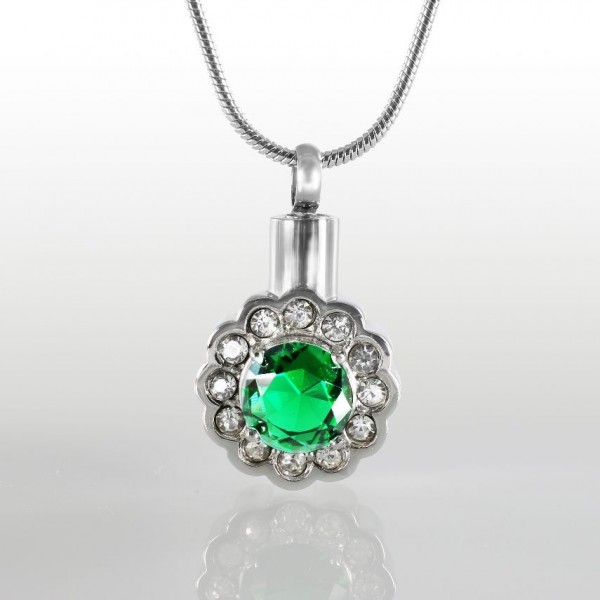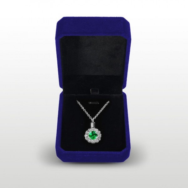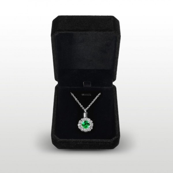 This gorgeous cremation pendant has been carefully designed taking inspiration from classic jewellery. The stunning green stone has been set with a border of brilliant white zirconia. This piece is a wonderful and tasteful way to hold your dearest loved one and the memories that you shared.